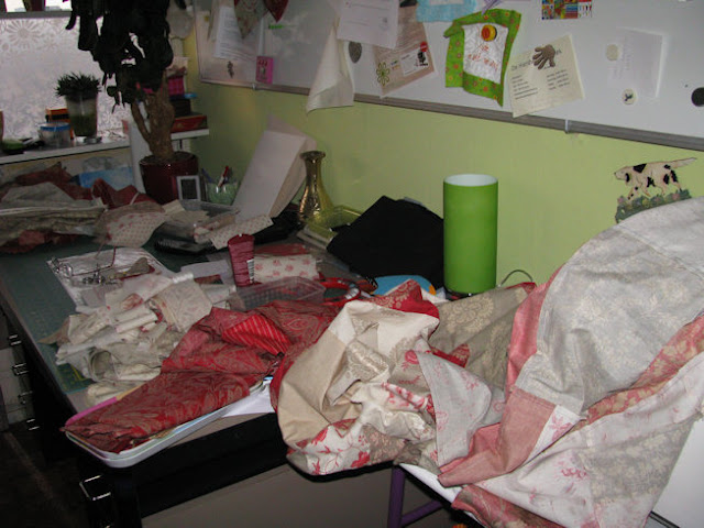 Zo ziet mijn quilttafel er nu uit..... Eens moet die lap rechts, daaronder staat mijn Janomeetje, een bedquilt worden. Deze maak ik, althans het patchen, op de machine.